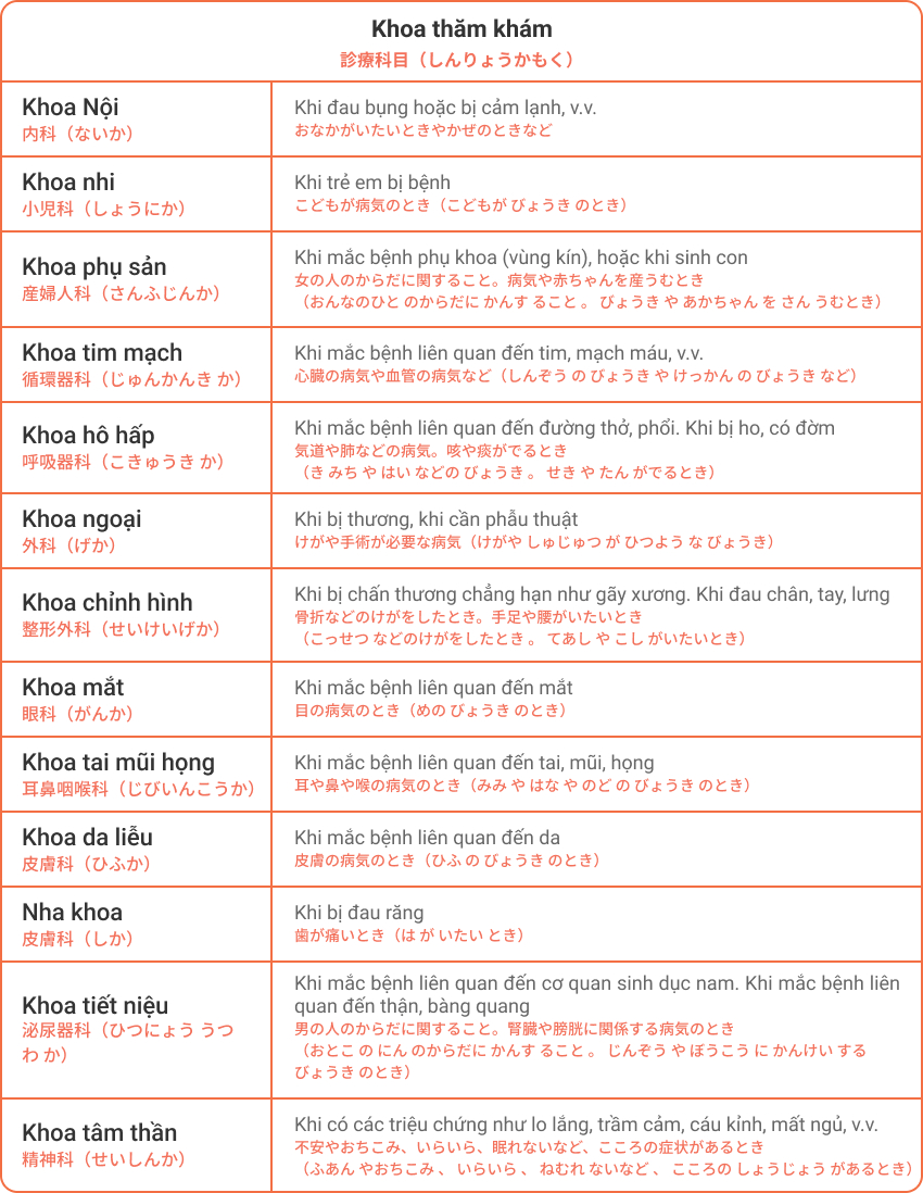 Bạn có thể tìm kiếm phòng khám và bệnh viện để tiếp nhận điều trị y tế tại Nhật Bản (tiếng Nhật). Nhấp vào「医療機関検索/tìm kiếm cơ quan y tế」 , sau đó chọn 都道府県/tỉnh thành, 言語/ngôn ngữ chọn「その他 /khác」 ,「診療科目/hạng mục thăm khám」 (Ⅰ1 -11), các hạng mục khác có thể bỏ trống. Mã VI trong hạng mục「診療科および言語/khoa và ngôn ngữ」 trong danh sách kết quả có nghĩa là tiếng Việt.