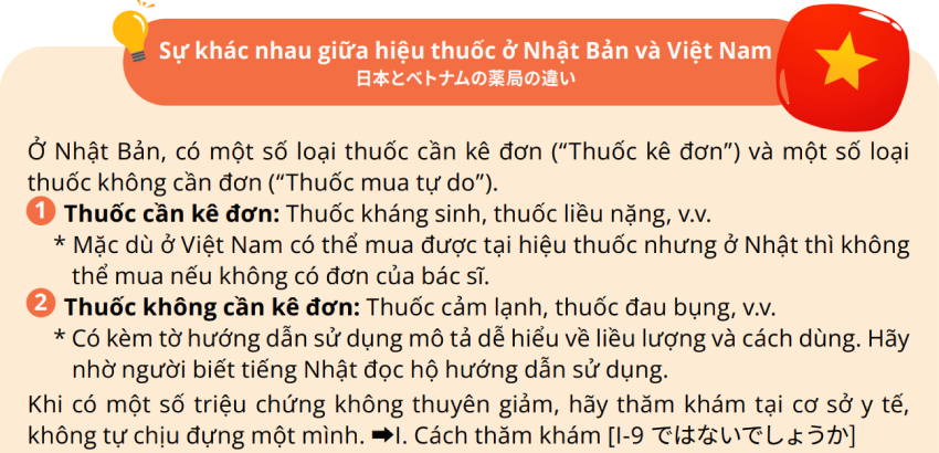 Khi mang thuốc sử dụng từ một (1) tháng trở lên vào Nhật Bản, hoặc khi gửi thuốc từ Việt Nam sang Nhật Bản thì cần phải làm thủ tục (xác nhận nhập khẩu). Ngoài ra, luật pháp Nhật Bản không cho phép bạn bán hoặc tặng, mua hoặc nhận thuốc tự mình mang vào Nhật Bản cho bạn bè, người quen. Tuyệt đối không được thực hiện hành vi này.